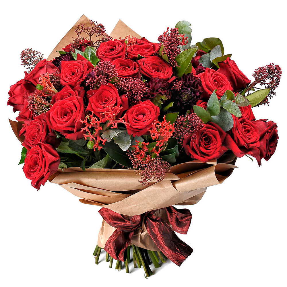 Роза одноголовая красная, зелень декоративная, озотамнус.