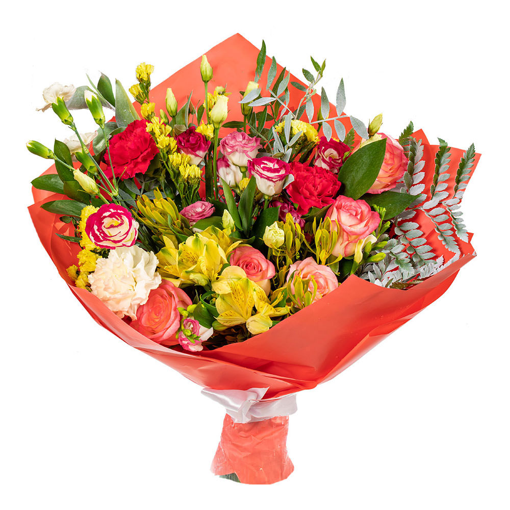 Роза одноголовая, эустома, гвоздика, альстромерия, зелень.