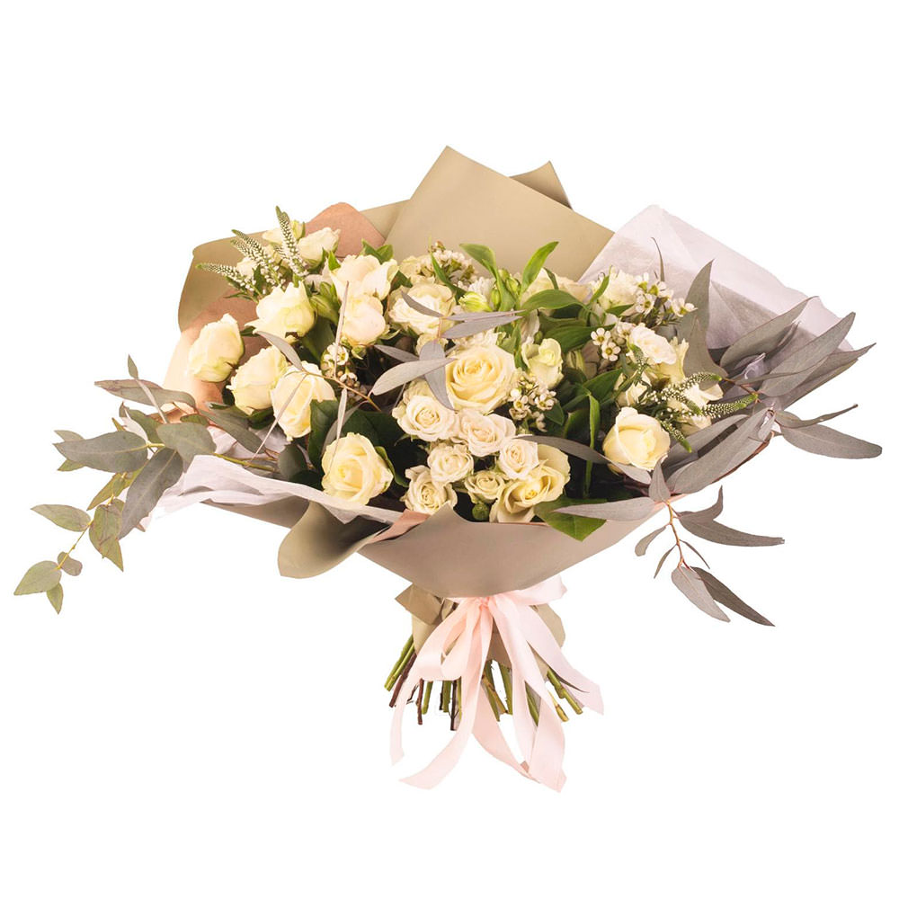 Кустовая роза кремовая, вероника, зелень.