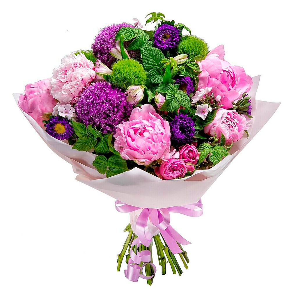 Пионы, розы кустовые, экзотическая зелень.