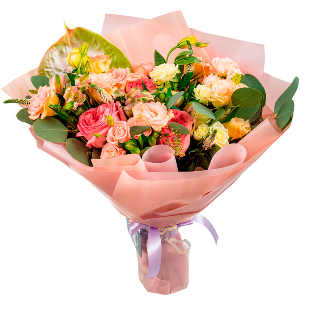 Роза одноголовая, эустома, роза кустовая, эвкалипт, экзотическая зелень.