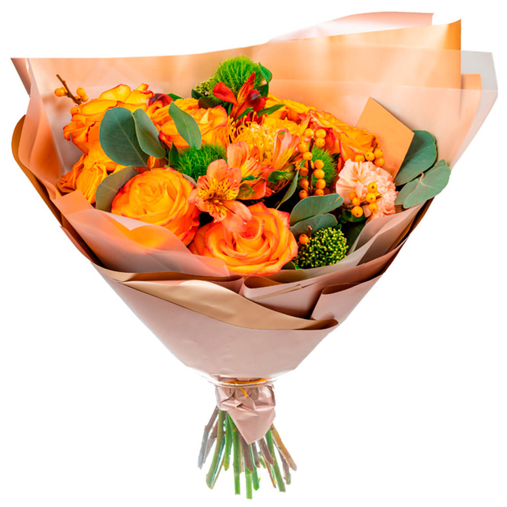 Роза одноголовая, альстромерия, гвоздика, гиперикум, эвкалипт, зелень.