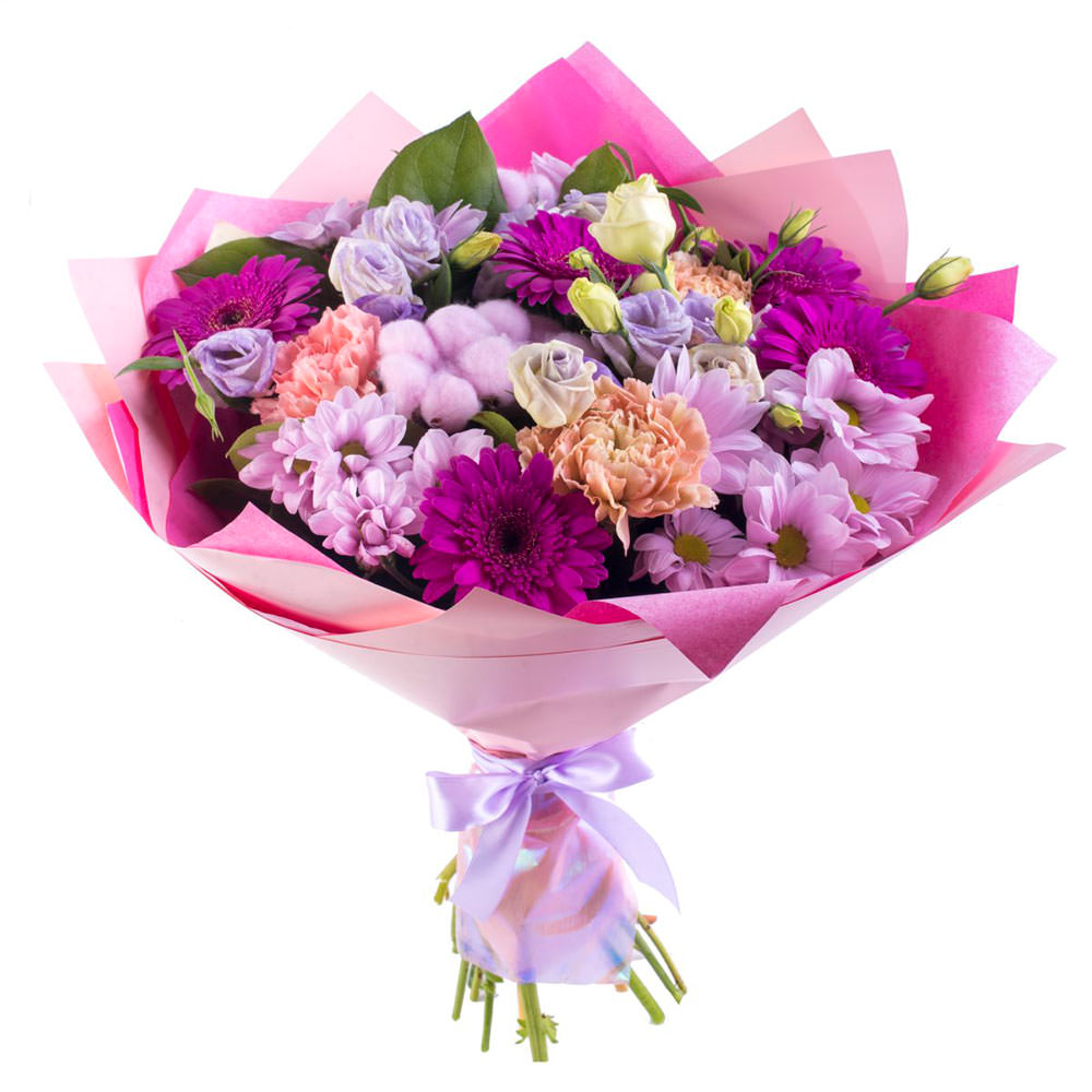 Гербера, хризантема кустовая, эустома, гвоздика, хлопок.