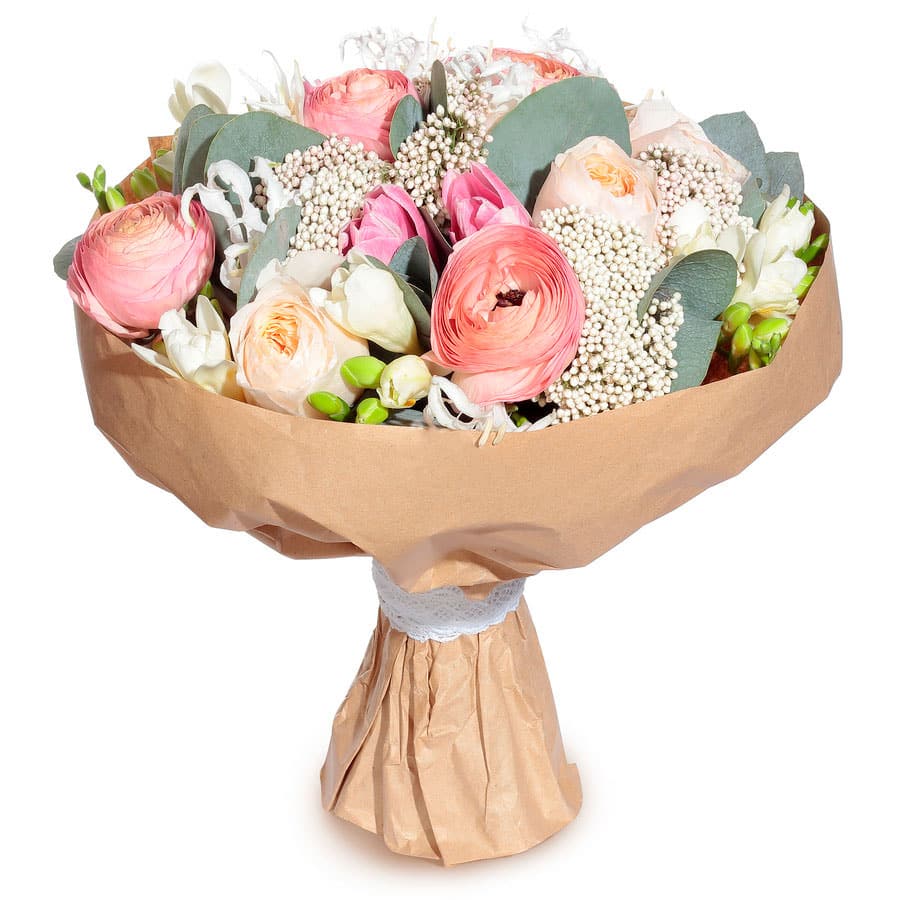 Роза пионовидная, ранункулус, тюльпаны, альстромерия, эвкалипт, сухоцветы.