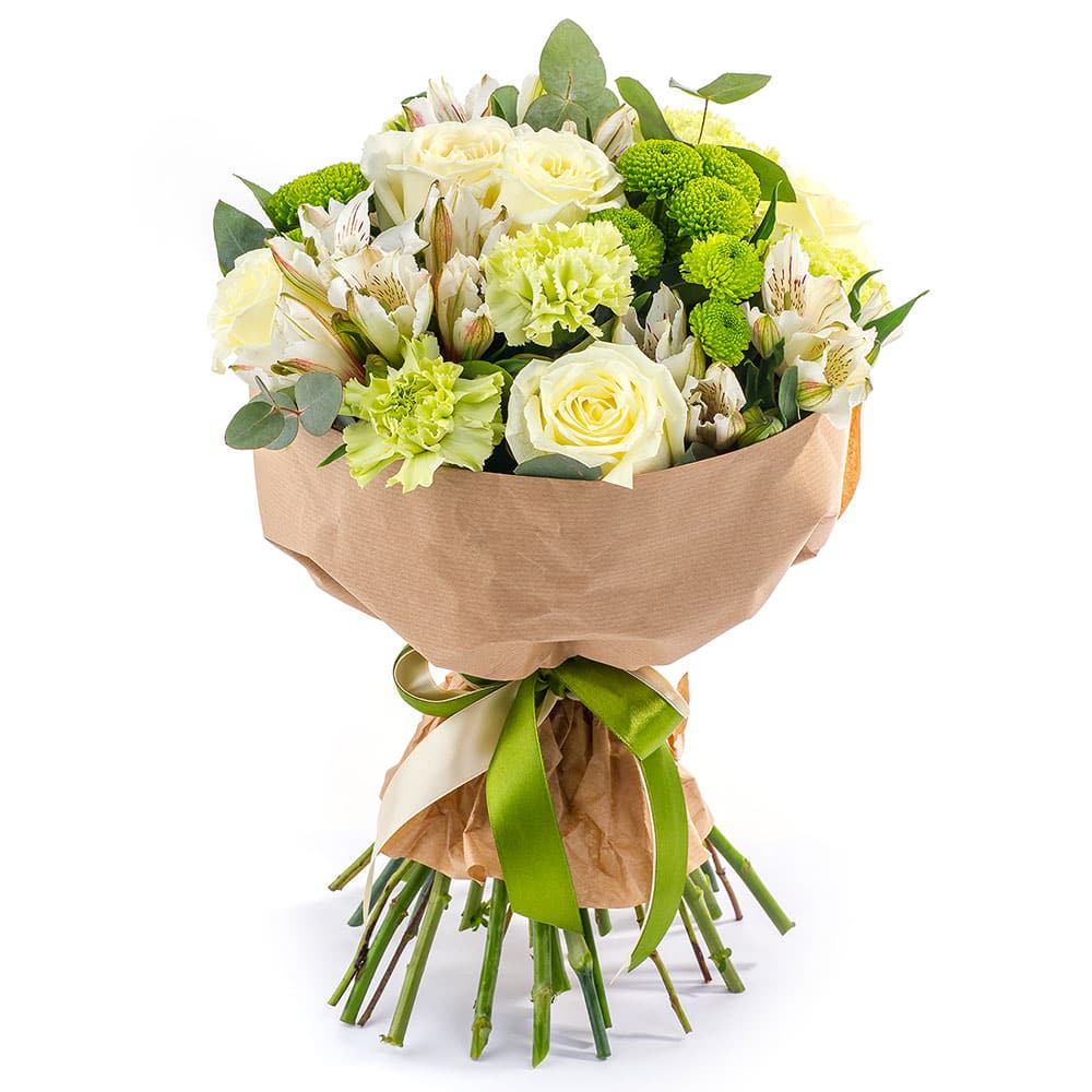 Роза одноголовая, альстромерия, хризантема, гвоздика, эвкалипт.